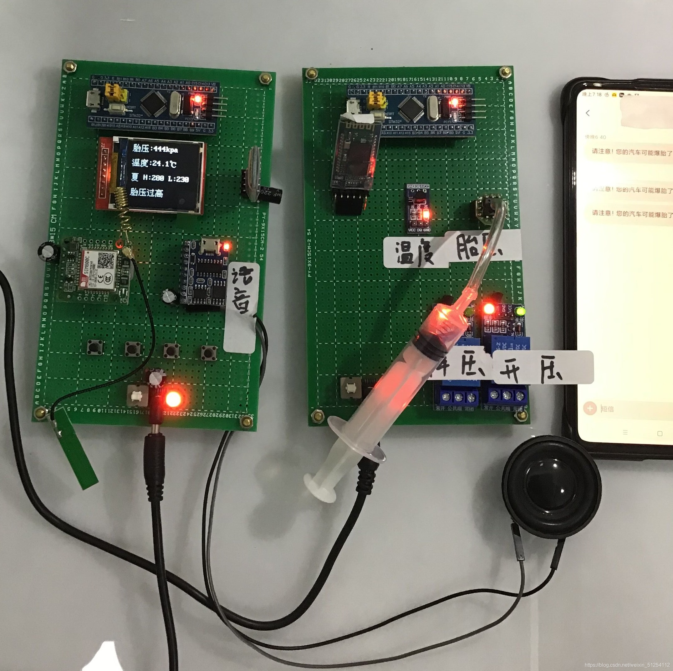 监测端由stm32单片机+18b20温度监测模块+胎压监测模块+双路继电器+蓝牙模块组成
