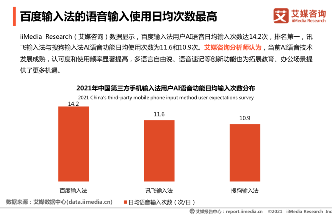 受2020年以来居家办公、教学的推动,高效的AI语音功能进一步得到认可,有超六成用户偏好使用。如我们所见,当前国内主流输入法竞相发力语音输入,抢占未来交互方式。从显示的数据来看,在主流输入法中,百度输入法语音输入的日均输入次数最多,达到14.2次,超六成用户认可其准确率最高。