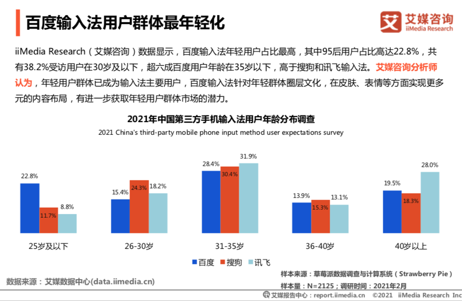 在国家大力推行5G、人工智能等大背景下,第三方手机输入法的发展也日渐成熟。艾媒咨询综合分析了行业发展情况、用户特征和典型案例,列举说明中国主流第三方手机输入法的一些行业数据,同时也预测了未来发展趋势。其中百度输入法优先推出了众多AI功能,包括智能帮写、智能纠错、智能预测、语音输入、AI自由手写等,大幅度提高了输入效率。同时,多元化、年轻化的内容和玩法,具有很强的社交属性和可玩性,获得了各个圈层的用户青睐。