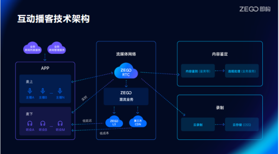 针对以上痛点体验,该采取什么措施?其实可以使用来自ZEGO即构的互动播客技术解决方案,它的技术框架如下,这个方案更加关注音频质量、麦位管理、多人开关麦切换、房间切换、高并发、内容审核等能力。