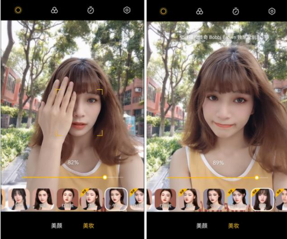 从下面的实拍图中,我们可以看到我们可以看到,在打开AI焕采美妆视频功能之后,手机里面的AI算法就会自动识别画面中的人像,然后在预览框上面实时显示夏日晴海妆、 裸感妆、 猫眼妆、 星黛妆、 烟熏妆等多种裸妆方案供我们选择,我们可以根据自己的喜好和不同环境下选择最适合自己的妆容,不必花长时间化妆也可以直接拍出一张美美的照片,可以说是十分好用。